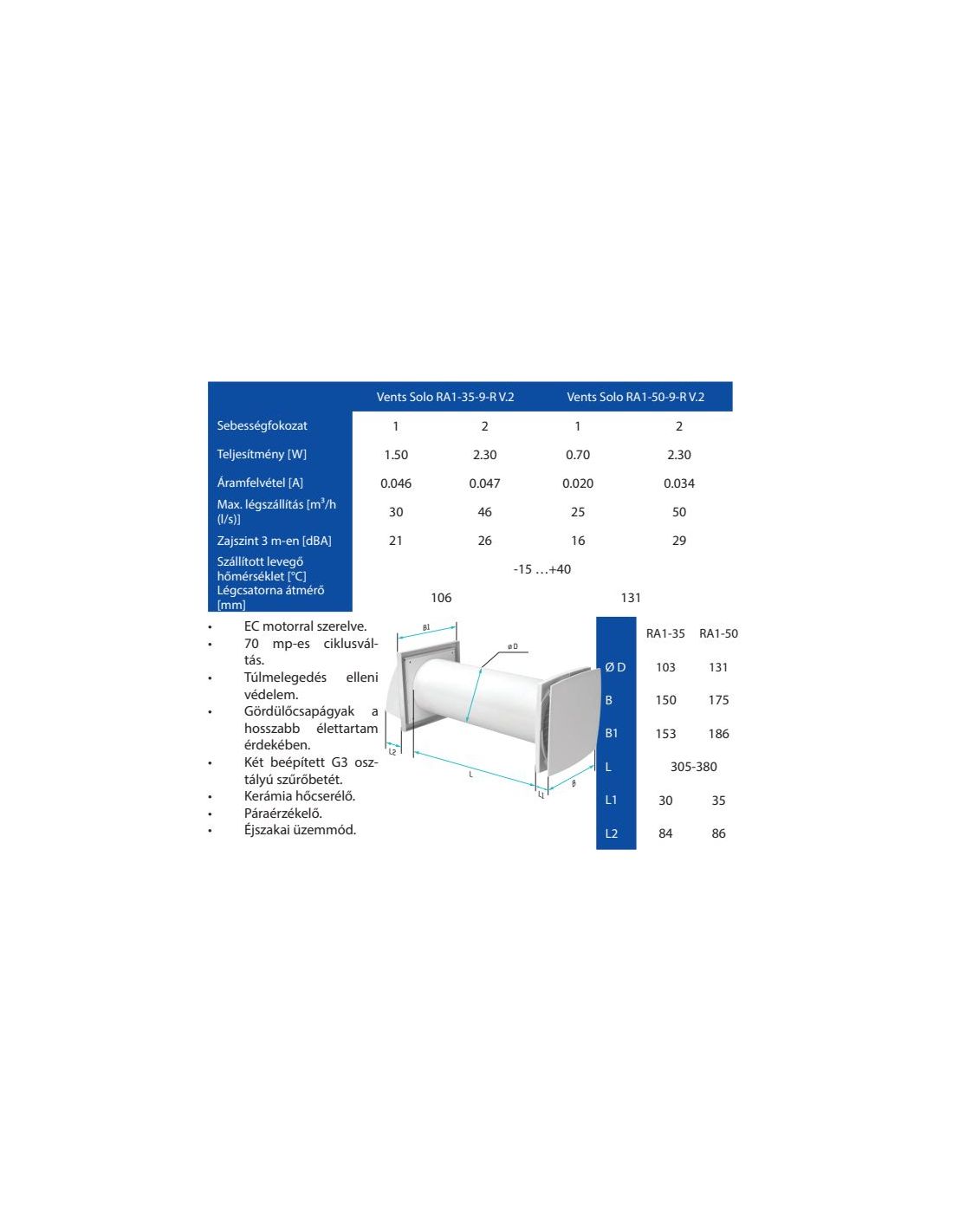 VENTS SOLO RA-1-50-9 R V.2 egyhelységes hővisszanyerős szellőztető