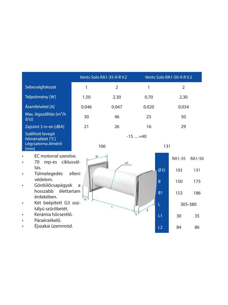 VENTS SOLO RA-1-35-9 R V.2 egyhelységes hővisszanyerős szellőztető