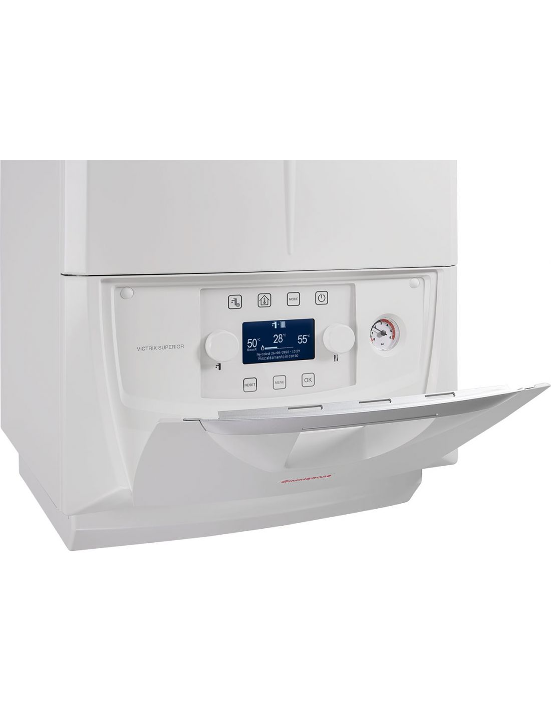 A Victrix Superior 35 Plus fali készülék 32,6 kW teljesítménnyel képes fűtési, illetve indirekt tárolós rendszerben használati melegvizet előállítani. A Victrix Superior 35 Plus kazán új, nagyteljesítményű hidraulikai egysége kis szervizigényű. A külső érzékelő (opcionális) csatlakoztatása esetén időjárásfüggő szabályozás (alap felszereltség) használata is lehetséges.