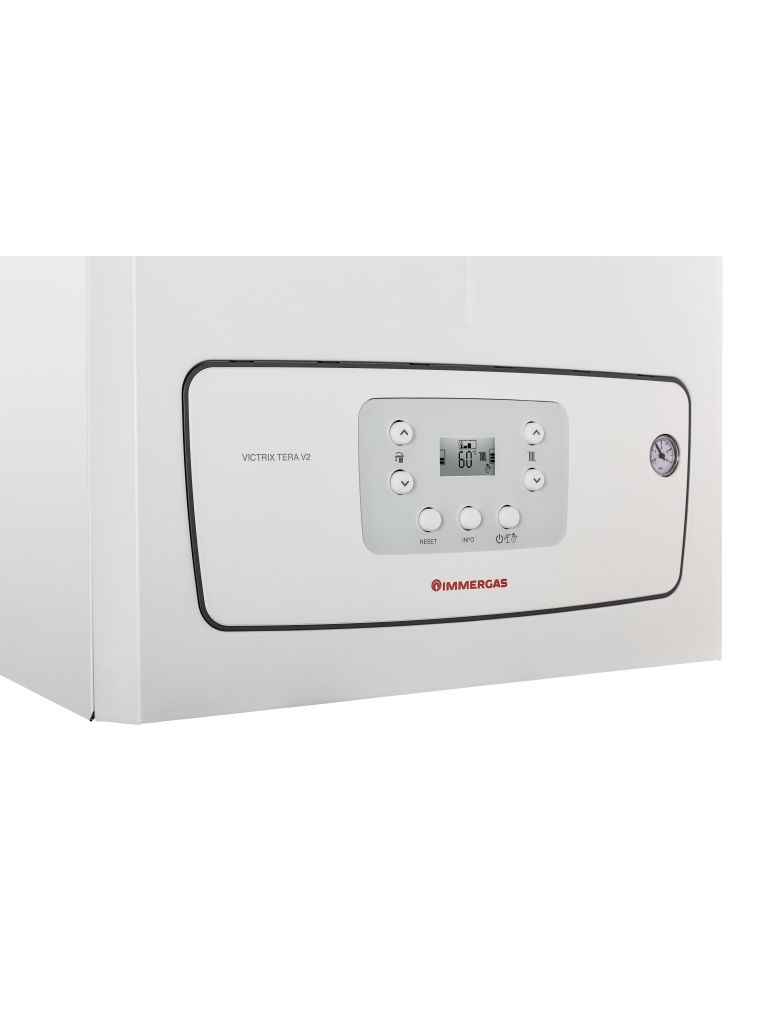 A Victrix TERA V2 28 fali készülék 24,0 kW teljesítménnyel képes fűteni, 28,0 kW teljesítménnyel átfolyós rendszerben használati melegvizet előállítani. Kis méreteinek köszönhetően a lakás szinte bármely részén elhelyezhető. A Victrix TERA V2 28 kazán alacsony energiaigényű Grundfos szivattyúval van szerelve, láng modulációs tartománya 18-100% közötti. Új, alacsony hőveszteségű, széles vízjáratú hőcserélőjének köszönhetően kimagasló hatásfokot képes elérni. A készülék az Amico távszabályzóval vagy a Dominus távfelügyelettel (opcionális) könnyen és gyorsan, a készüléktől távolról is vezérelhető. Külső érzékelő (opcionális) csatlakoztatása esetén időjárásfüggő szabályozás (alap felszereltség) használata is lehetséges. Felhasználóbarát elektronikájának köszönhetően egyszerűen üzemeltethető, az állapotjelző ábrák könnyen értelmezhetők.