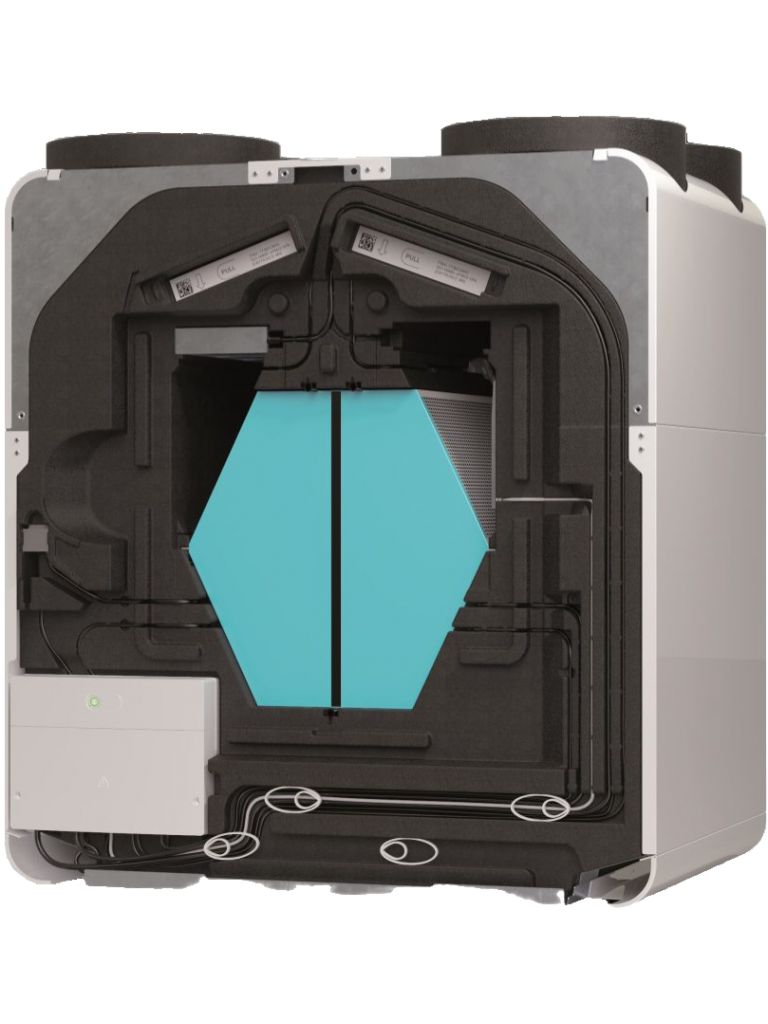 - A készülék a kivezetett levegőben lévő hő akár 90%-át is visszanyeri, ezzel csökkentve a szellőztetés által okozott energiaveszteség
