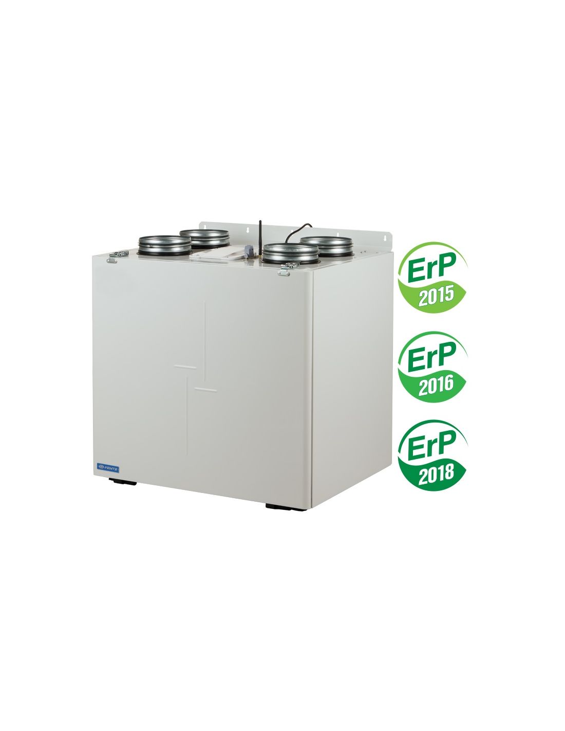 Hővisszanyerős légkezelő berendezés az energiahatékony szellőztetés kialakításához lakásokban, családi házakban, irodákban és egyéb helyiségekben. Hő és akár páravisszanyeréssel csökkenthetjük az energiafelhasználást és növelhetjük a komfortot a belső terekben. Vezérléssel testreszabható és igény szerint szabályozható a szellőzés az épületben. Légkezelő berendezés álló vagy oldalfali beépítés, EC motor, vertikális 200 mm-es csonkokkal, keresztáramú hővisszanyerővel, beépített automata bypassal, heti program lehetőséggel, mobil telefonos applikációval és távoli elérési lehetőséggel. 550 m3/h 325 Pa teljesítménnyel. Elő és utófűtő vezérlési lehetőséggel.