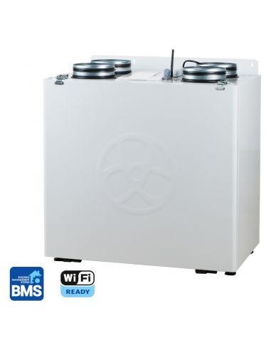 Hővisszanyerős légkezelő berendezés az energiahatékony szellőztetés kialakításához lakásokban, családi házakban, irodákban és egyéb helyiségekben. Hő és akár páravisszanyeréssel csökkenthetjük az energiafelhasználást és növelhetjük a komfortot a belső terekben. Vezérléssel testreszabható és igény szerint szabályozható a szellőzés az épületben. Légkezelő berendezés álló vagy oldalfali beépítés, EC motor, 200 mm-es csonkokkal, keresztáramú entalpia hővisszanyerővel, beépített automata bypassal, heti program lehetőséggel, mobiltelefonos applikációval és távoli elérési lehetőséggel. 550 m3/h 325 Pa teljesítménnyel, S21 vezérléssel. Elő és utófűtő vezérlési lehetőséggel.