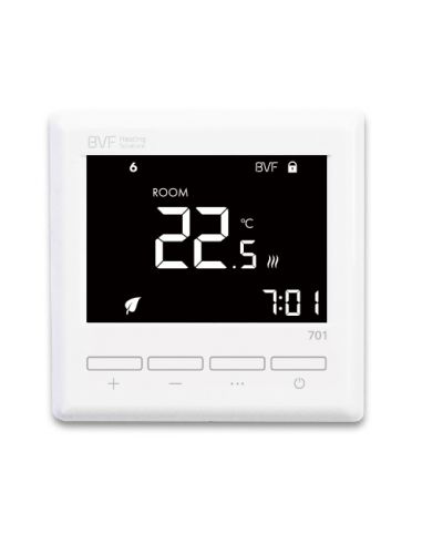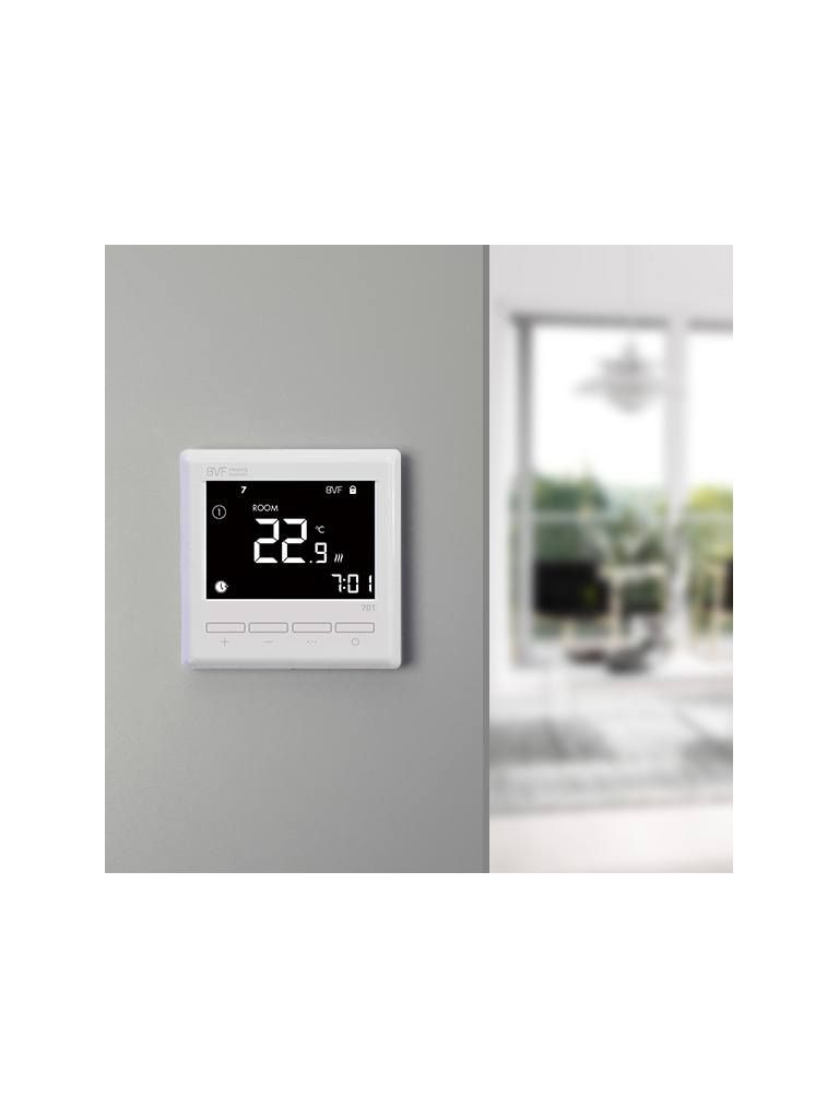 A BVF 701 programozható szobatermosztát alkalmas minden típusú elektromos fűtés és elektromos padlófűtés vezérlésére. A BVF termosztátokra jellemző nagy teljesítményű teljesítménykapcsolóval szerelt hátoldal extrém igénybevétel mellett sem melegszik fel, valós hőmérséklet érzékelés pontosabb mint valaha.