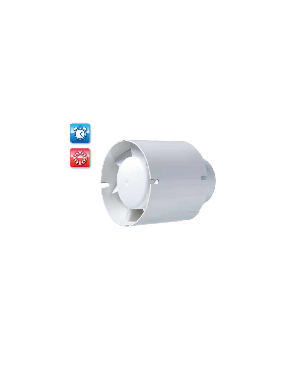 UV-álló ABS műanyagból készült, fürdőszoba, zuhanyzó, konyha és egyéb használati helyiség folyamatos vagy időszakos elszívására. Háztartási csőventilátor, 125 mm légcsatornához. Időkapcsolóval. Golyóscsapágyas kivitel.