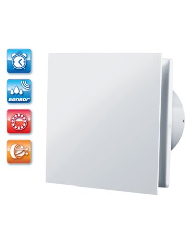 UV-álló ABS műanyagból készült, fürdőszoba, zuhanyzó, konyha és egyéb használati helyiség folyamatos vagy időszakos elszívására. Intelligens és energiahatékony háztartási ventilátor, 100 mm légcsatornához, időrelével és páraézékelővel. Golyóscsapágyas kivitel.