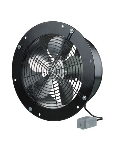 Befúvó vagy elszívó ventilátorok olyan helyiségekhez, ahol nagy légáramlás szükséges viszonylag alacsony ellenállás mellett. Kültéri falra szerelhető. Fém házas kisnyomású axiálventilátor, külső kötődobozzal, 250 mm néveleges méretben, 1070 m3/h, 230 V, 50 Hz, IP X4
